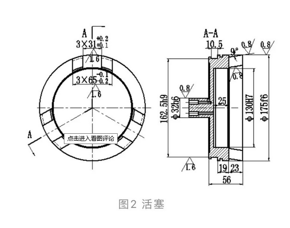 工作性质要求该活塞只能轴向往复运动,而不能相对转动。活塞右端具有6哥凸楔并构成3对,每对凸楔均相互平行,可分别于动力楔块两侧的斜槽相滑动配合,因此该活塞结构较为复杂。